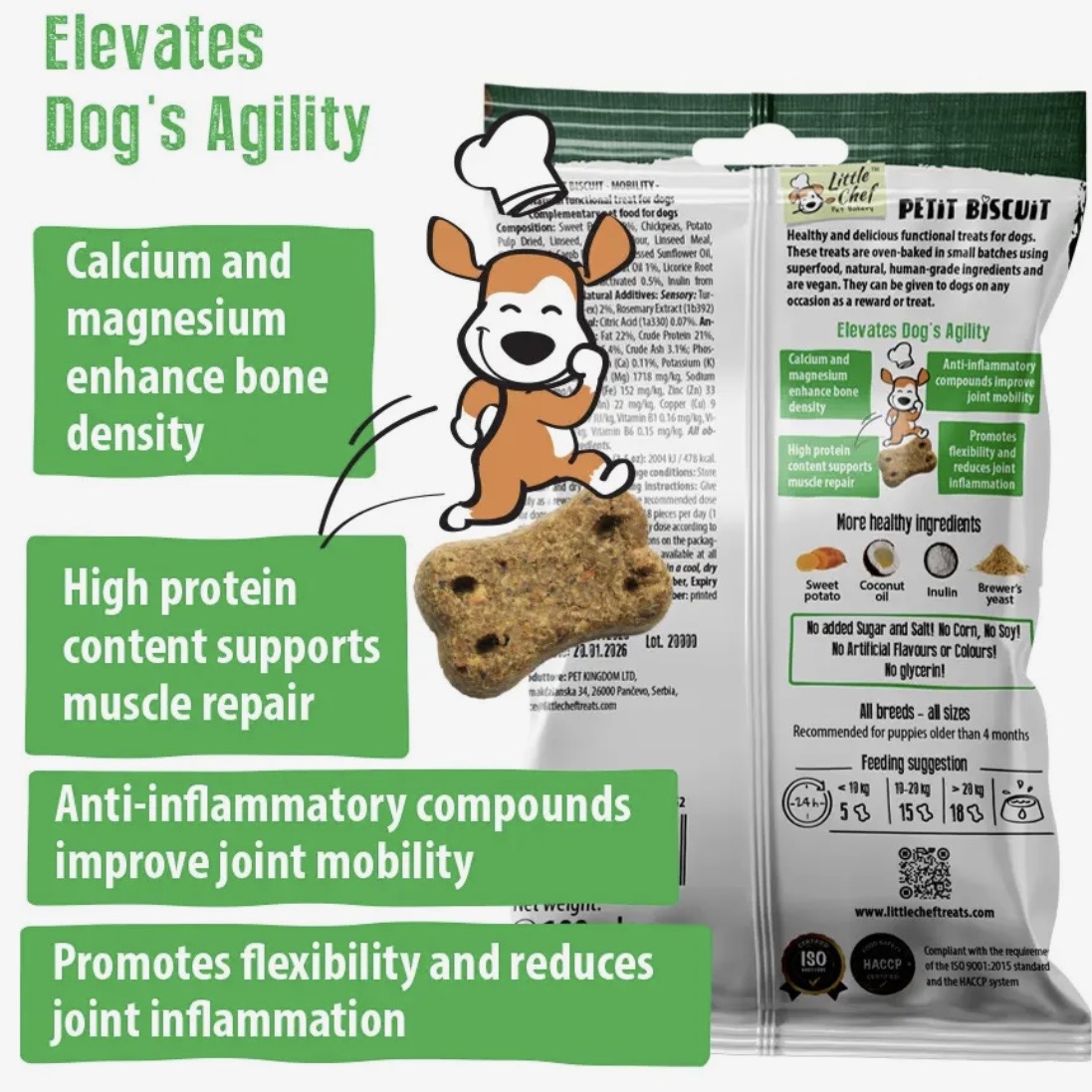 Friandises fonctionnelles véganes et sans céréales pour chiens, spécialement conçues pour le soutien de la mobilité.