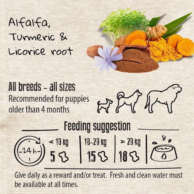 Composition: patate douce 20%, pois chiches, pulpe de pomme de terre séchée, graines de lin, farine de citrouille, farine de lin, graines de sésame, farine de caroube, huile de coco pressée à froid 3%, luzerne 3%, curcuma 2%, racine de réglisse 0.5%, levure de bière 0.5%, inuline 0.5%, carbonate acide de sodium.